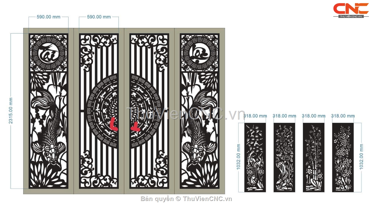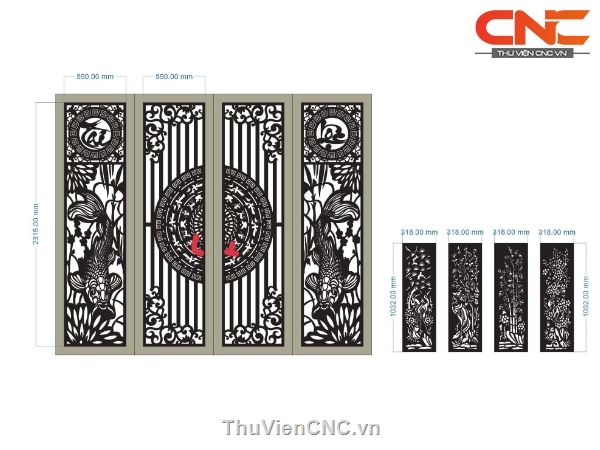 File cnc cổng 4 cánh trống đồng cá chép và tùng cúc trúc mai