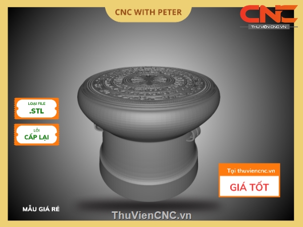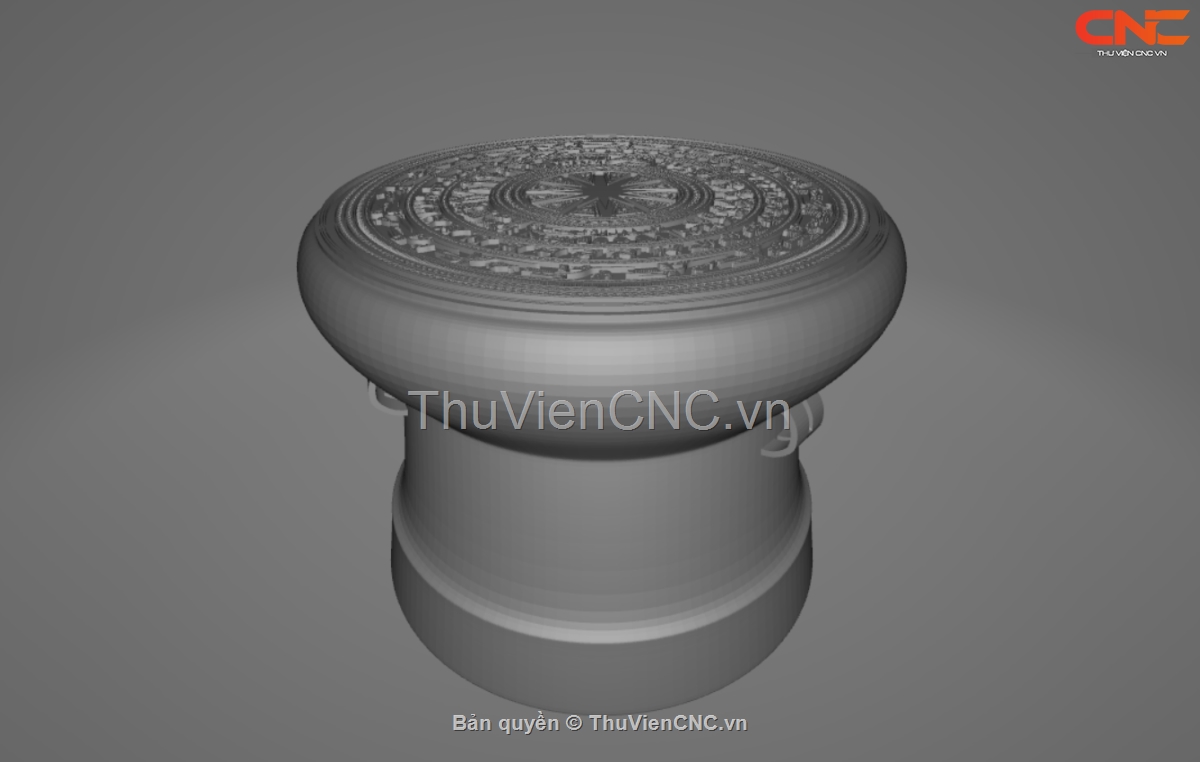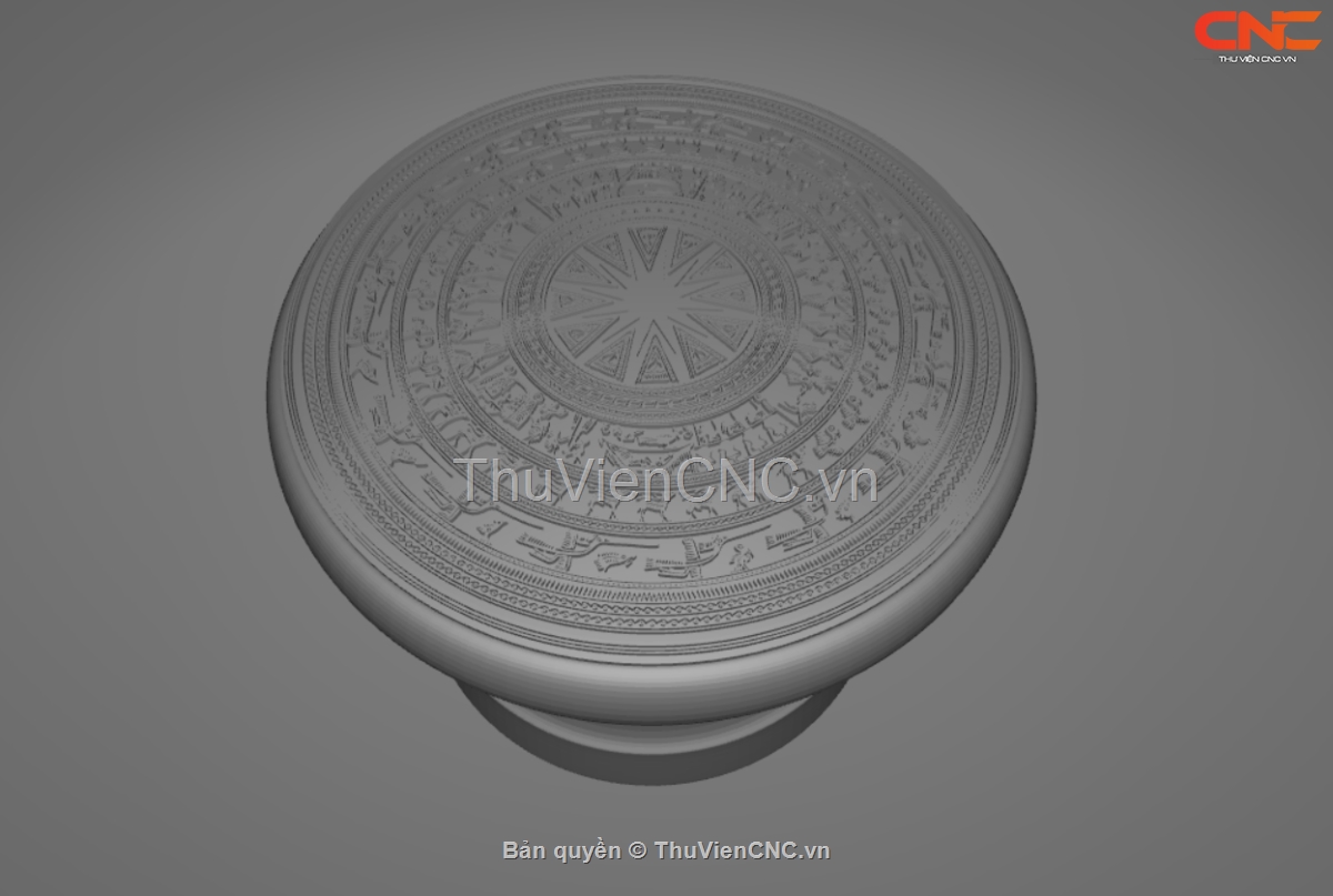 Mẫu file CNC Trống Đồng Lạc Việt, họa tiết chuẩn văn hóa Đông Sơn, khắc chi tiết chim Lạc, người múa, mặt trời 14 tia cổ đại. File STL tinh xảo, xuất dao sẵn, tương thích ArtCAM, Aspire