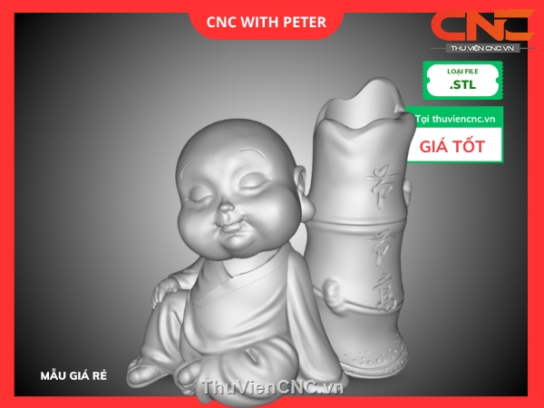 Mẫu file CNC Chú Tiểu ôm bình hoa, chi tiết tinh xảo, file STL xuất dao sẵn. Tương thích ArtCAM, Aspire; phù hợp khắc gỗ, composite, resin, in 3D hoặc làm tượng trang trí nghệ thuật phong thủy.