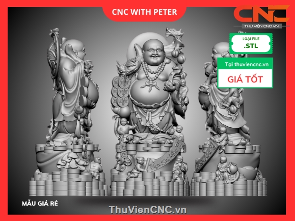 File CNC Di Lạc vác cành đào – tượng trưng cho phúc lộc, trường thọ và niềm vui viên mãn. File STL chi tiết, xuất dao sẵn, tương thích ArtCAM, Aspire, dùng cho khắc gỗ, resin, composite hoặc in 3D.