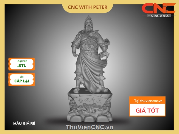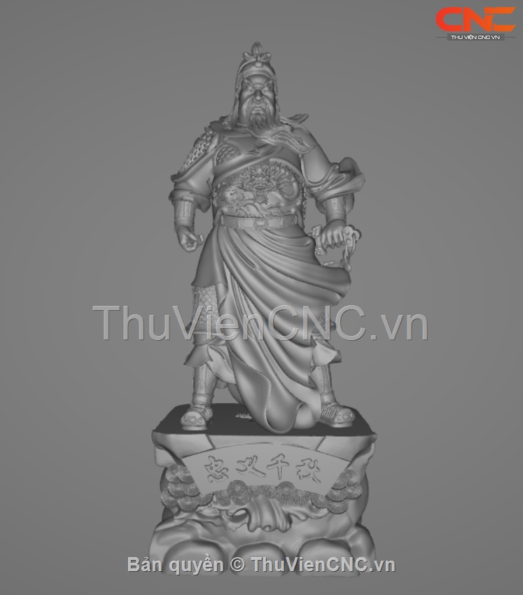 Mẫu file CNC Quan Công đứng cầm đao, tạo hình oai phong, chi tiết tinh xảo, tỉ lệ chuẩn. File STL tương thích với ArtCAM, Aspire, và có thể dùng cho CNC gỗ, in 3D nhựa, composite, resin hoặc đúc đồng.