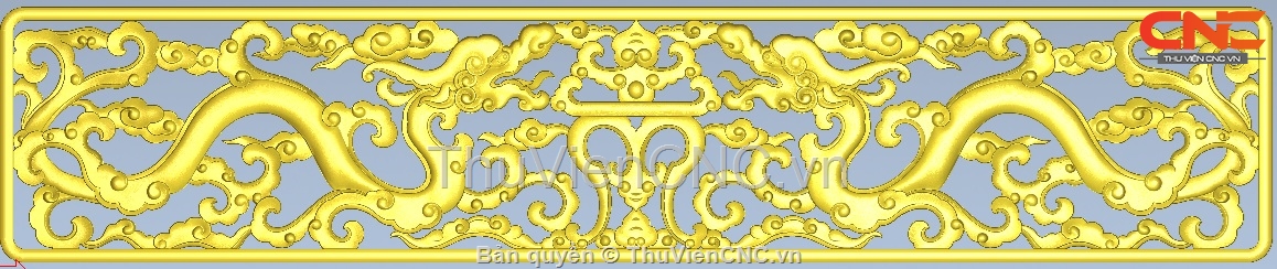 Hoa văn rồng mây dạng phù điêu, bố cục đối xứng, gồm các đường uốn lượn mềm mại của mây và hình rồng cách điệu chạy dài theo chiều ngang.