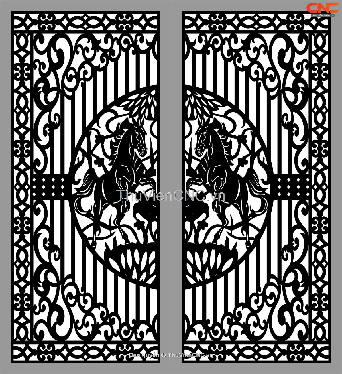 Thiết kế họa tiết, hoa văn rất tinh tế và thuần khiết. Mẫu cnc cổng 2 cánh ngựa cnc sang trọng, hoa văn độc đáo. Cắt cnc chính xác đến từng chi tiết nhỏ nhất. Mọi người cần tham khảo thêm nhiều mẫu vào trang cá nhân của mình nhé.