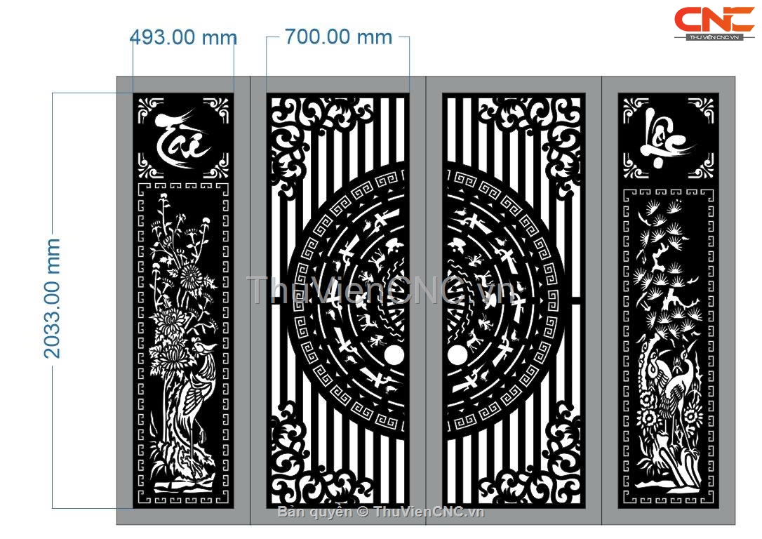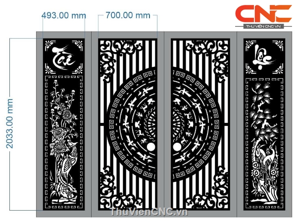Mẫu cổng 4 cánh tài lộc tùng cúc trúc mai cnc