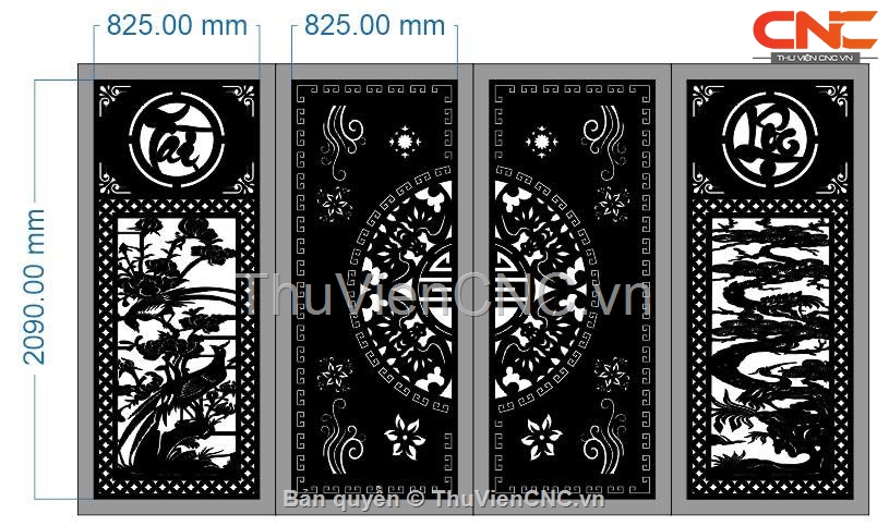 Model 2d cnc cổng 4 cánh tài lộc trống đồng