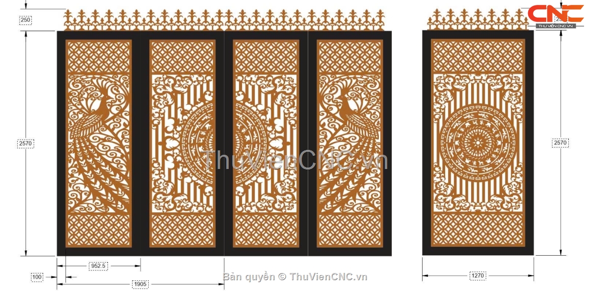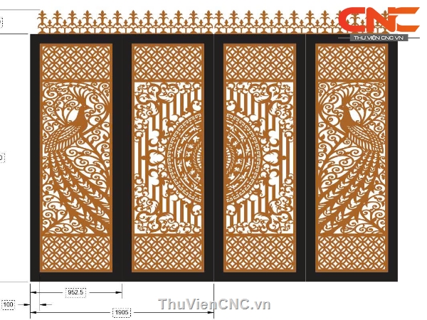 Model cnc cổng 4 cánh chim công trống đồng và 1 cánh