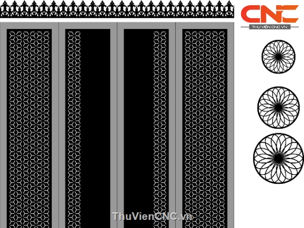 Model cnc cổng 4 cánh có chông và hoa văn mái kính