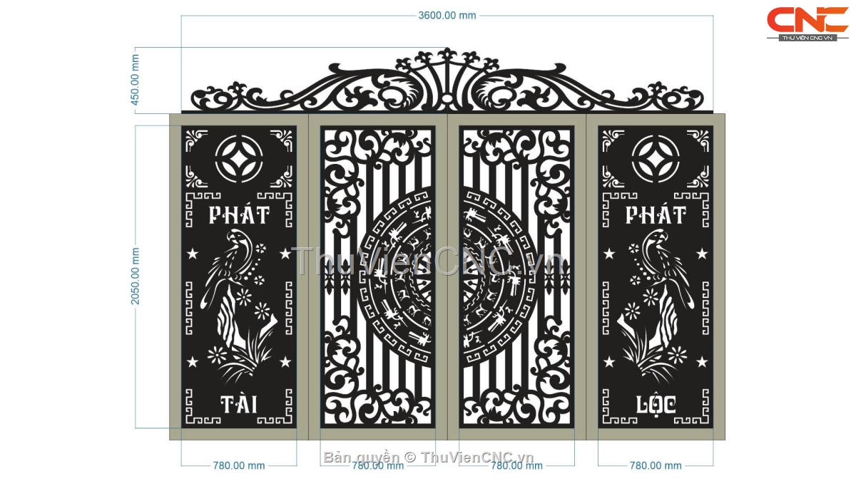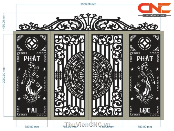 Model cnc cổng 4 cánh phát tài phát lộc chim kết hợp trống đồng