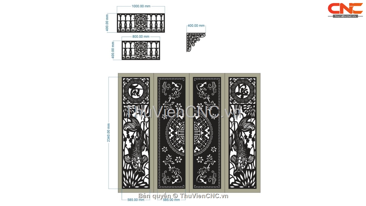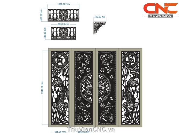 Model cnc cổng 4 cánh tài lộc kết hợp hàng rào và hoa góc