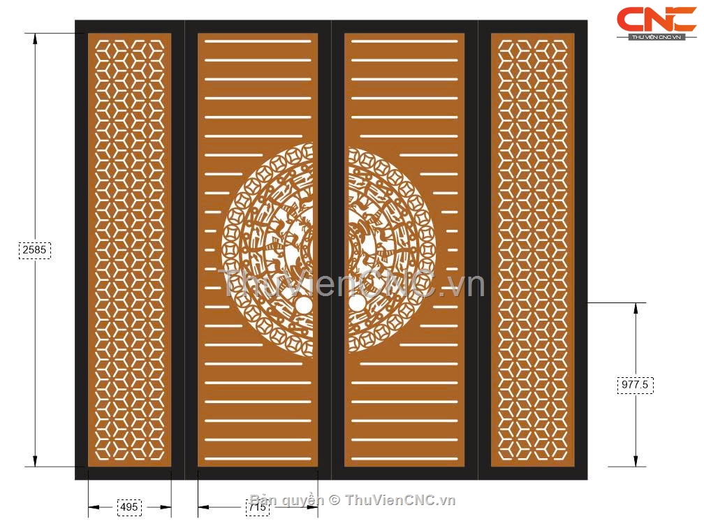 - Mẫu CNC, ngày nay, việc sử dụng file mẫu CNC như cửa chính, cửa cổng, hàng rào, lan can hiên, vách ngăn cầu thang, vách ngăn phòng thờ dù bằng sắt hay gỗ, hoặc phào chỉ thạch cao,..