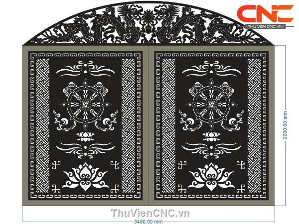 Model cổng 2 cánh bánh xe pháp luân và chóp rồng