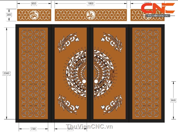 Thiết kế cổng 4 cánh trống đồng và ô thoáng phúc lộc thọ cnc