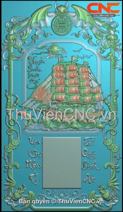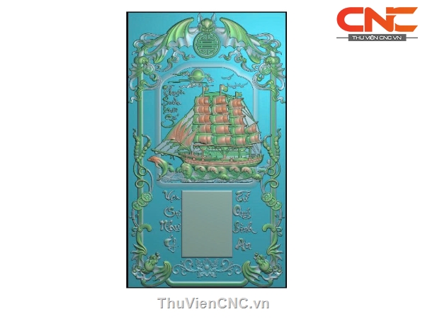 Mẫu 3D đốc lịch Thuận Buồm Xuôi Gió được thiết kế theo phong cách phù điêu nổi sâu, tạo hiệu ứng khối mạnh mẽ khi gia công CNC trên gỗ hoặc vật liệu composite. Tổng thể bố cục được chia thành 3 lớp chính: thuyền buồm – cảnh quan – khung đốc lịch, tạo chiều sâu tự nhiên và cân đối.
