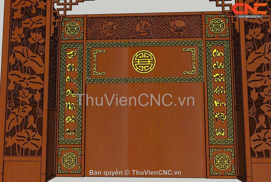 Vách thờ hiện đại, 4 mặt, câu đối thư pháp file sketchup chuẩn sản xuất abf